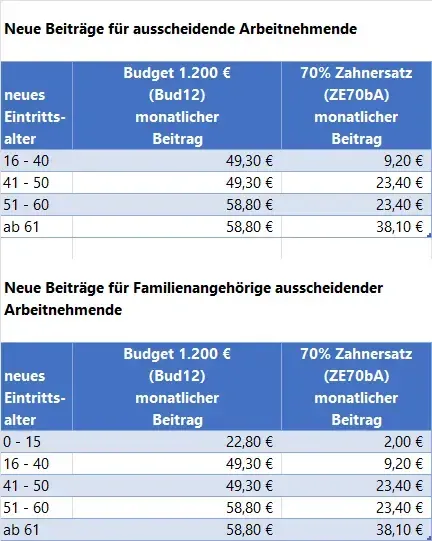 Das gilt sowohl für den eigenen Vertrag des/der Arbeitnehmenden sowie für ggf. bereits bestehende Verträge mitversicherter Familienangehörige. Der Beitrag wird pro Person zum Alter bei Austritt neu kalkuliert; Beitragsrabatte aus dem Gruppenvertrag des Arbeitgebers entfallen.